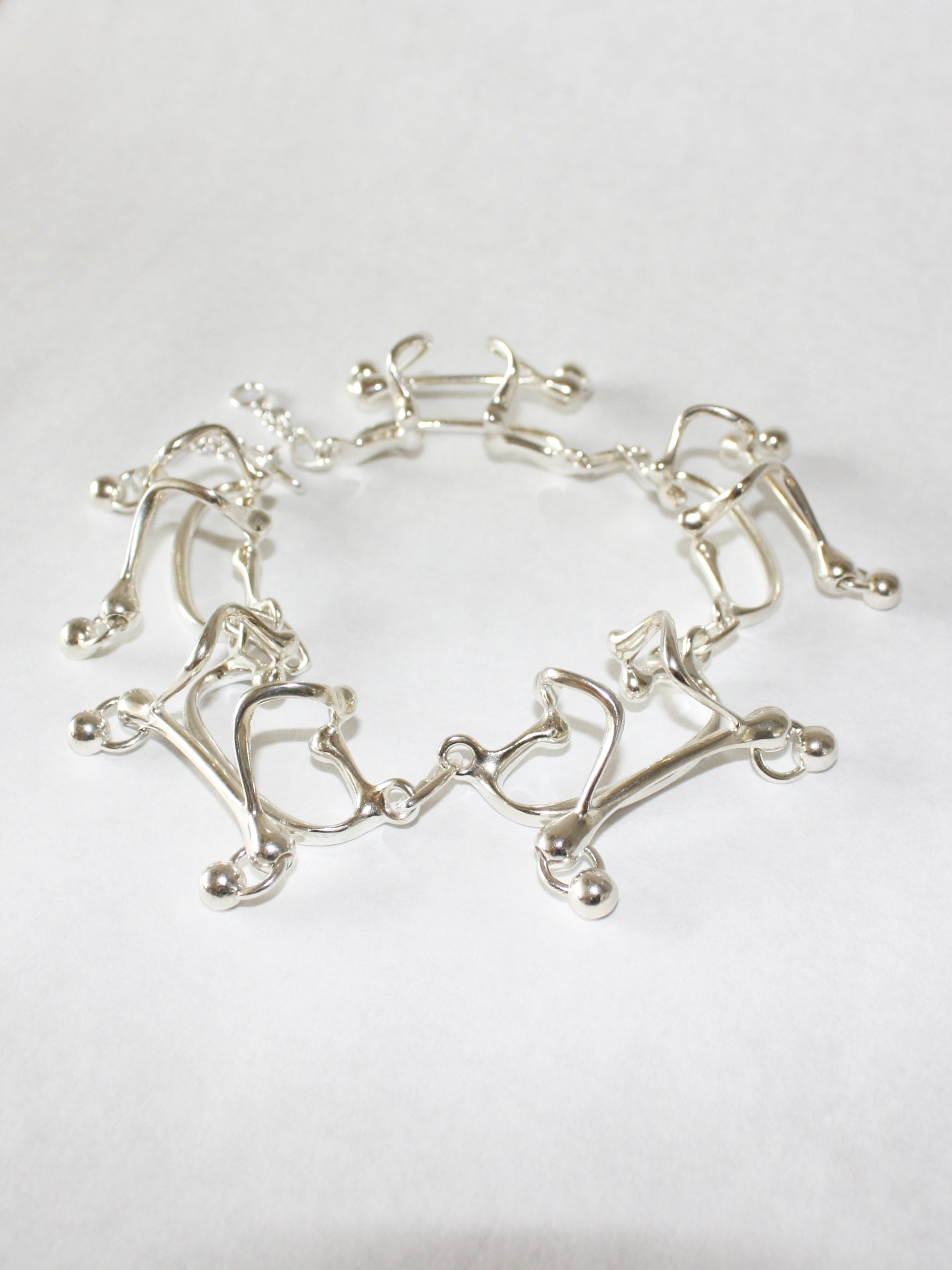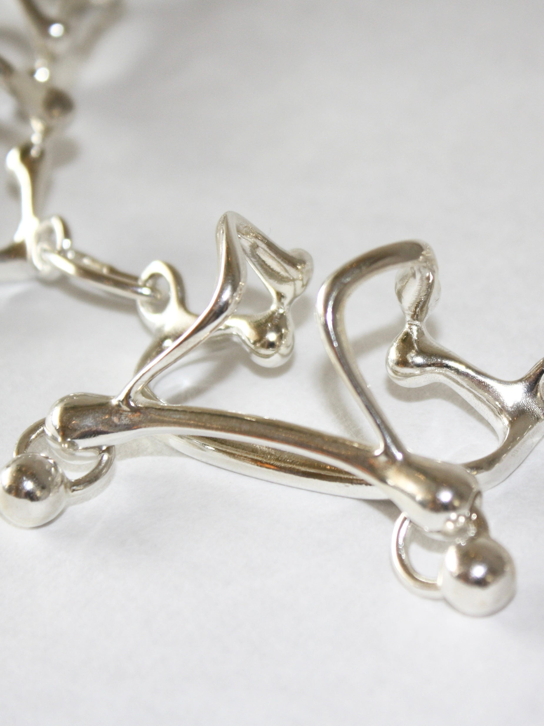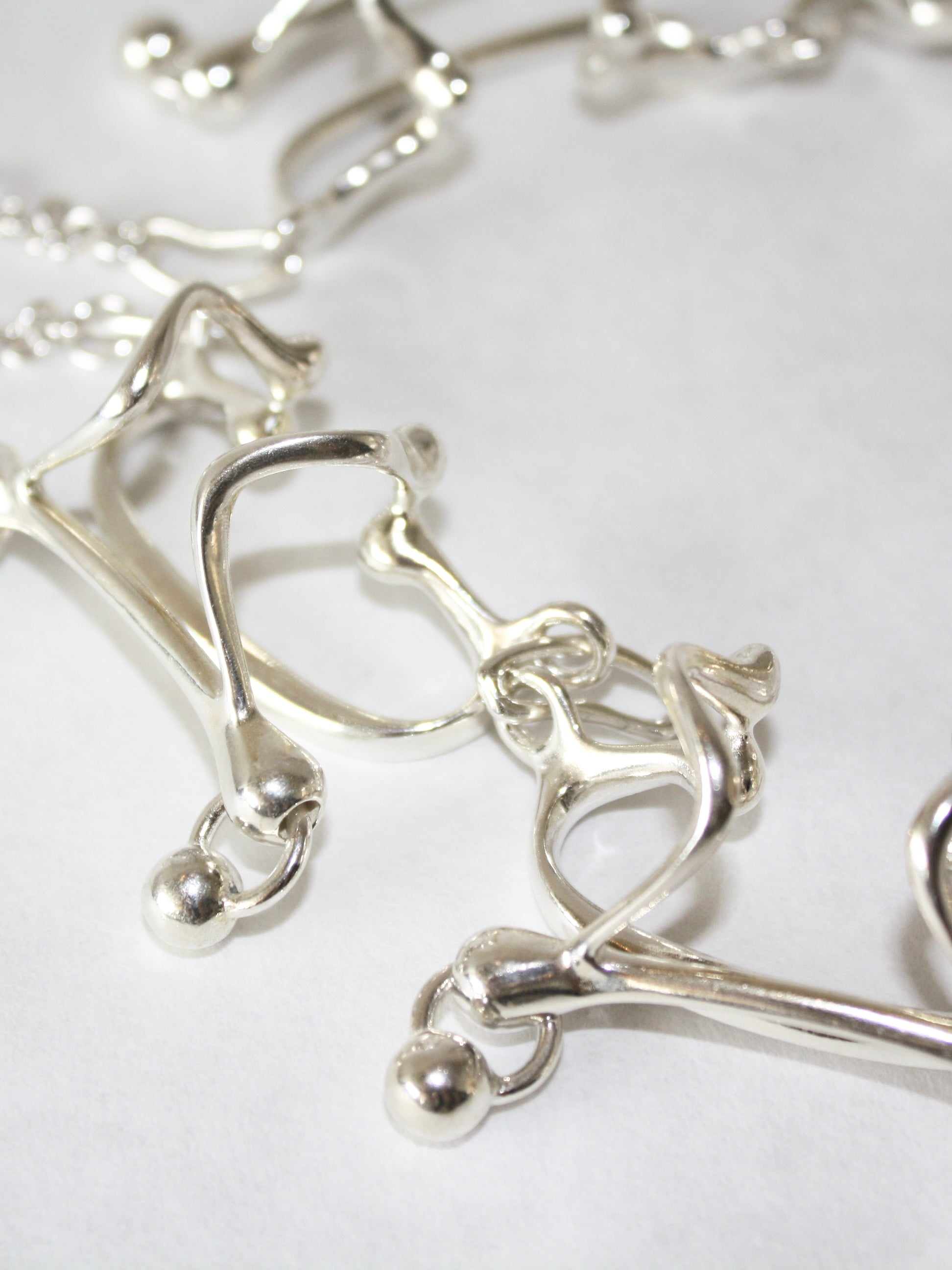 Sculptural 5-link necklace with arching shapes that come up and off the neck. Each link includes 2 kinetic beaded jump rings.