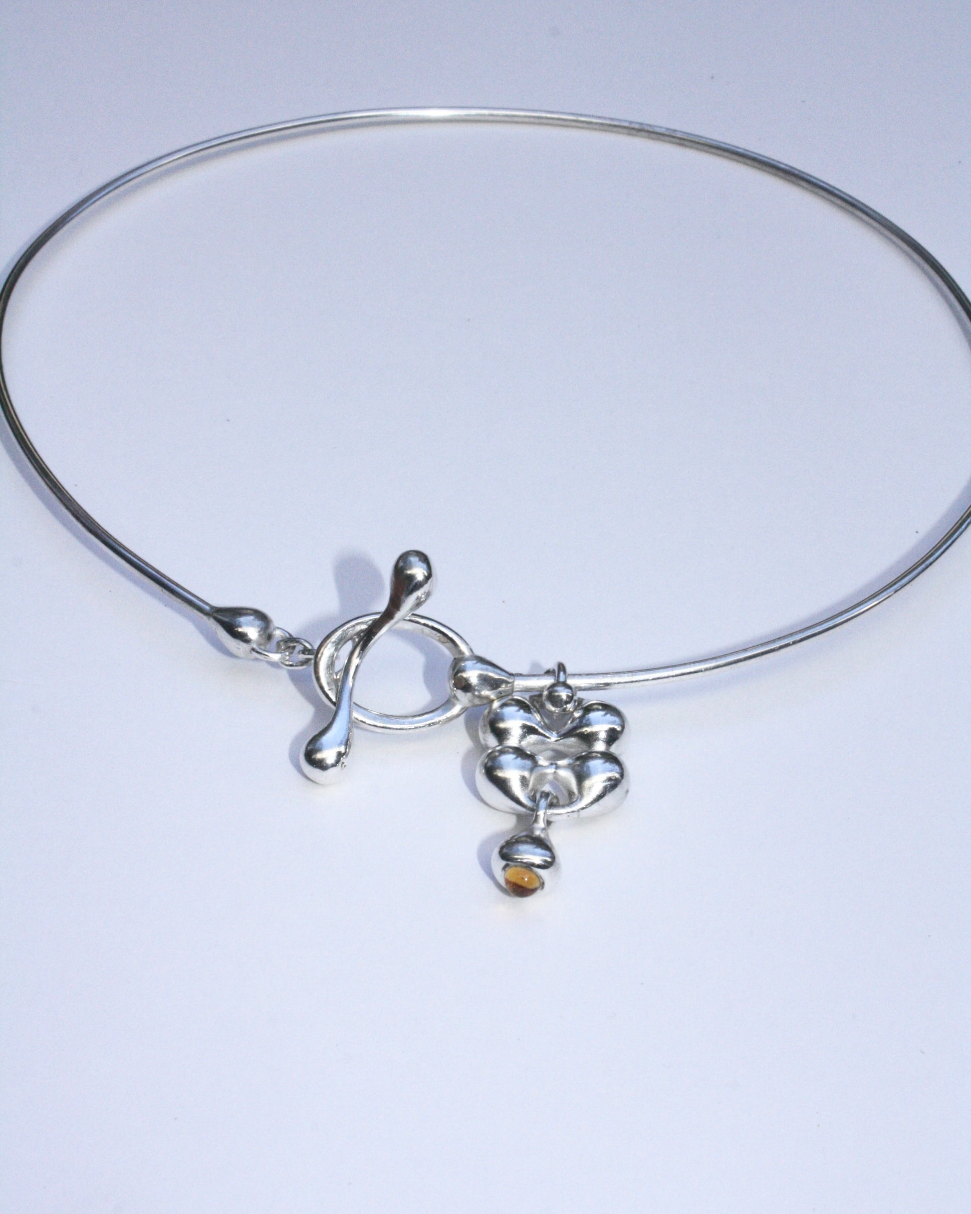 Sterling silver choker that includes a solid double-hourglass pendant and a suspended bell charm. The charm houses a flush-set 4 mm citrine cabochon with a subtle warm glow. The choker closes with an oversized clasp that compliments the pendant and can be worn in the front as shown.