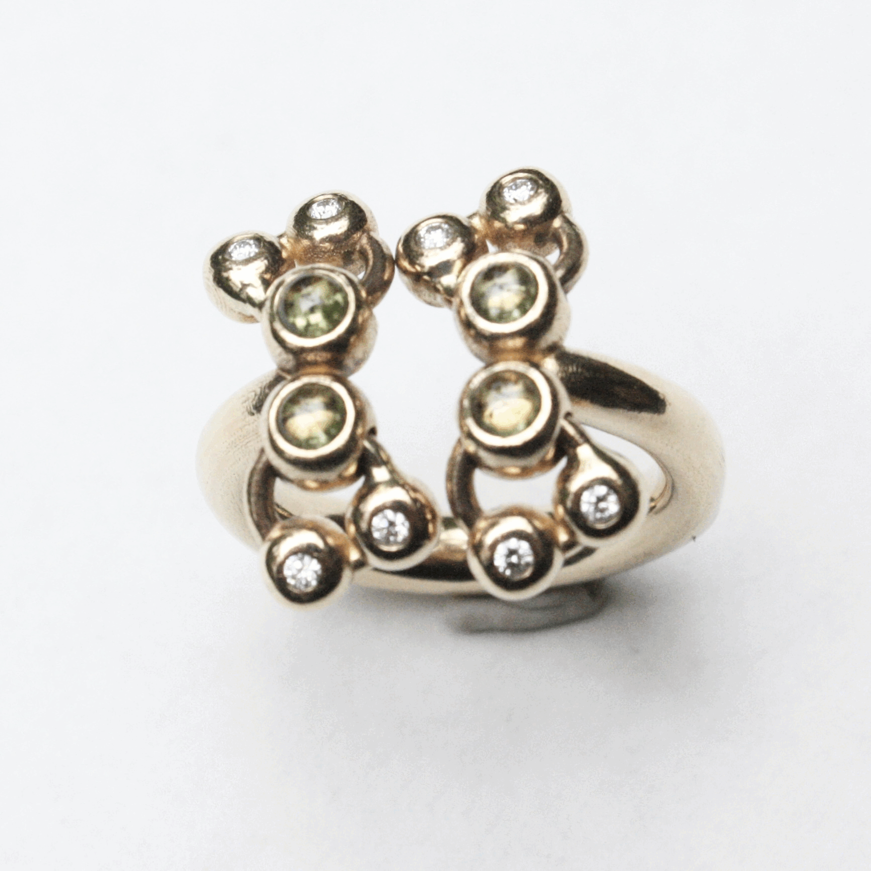This 14k gold ring is kinetic with a lot of charisma ! It includes 4 beaded jump rings that move with you, 4 flush set central cabochons, and 8 flush set 1.5 mm brilliant SI1-SI2 diamonds. In this prototype, I set 4 central peridot cabochons for this warm olive green tone.